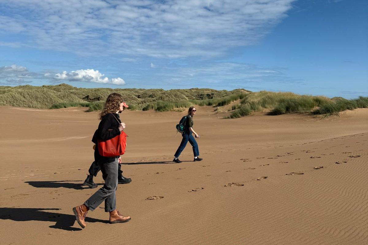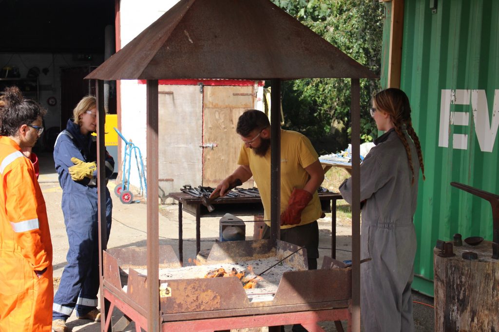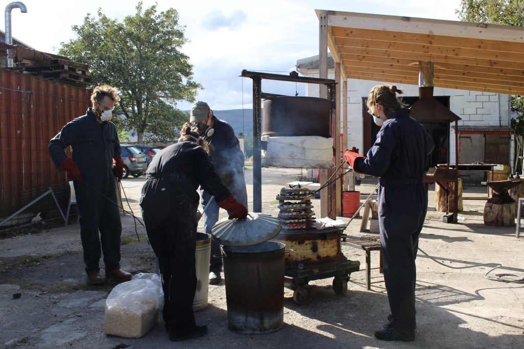 Over the course of their month-long residency, the group had inductions and support in ceramics, metalwork, blacksmithing and stonework. Alongside developing their practices in the workshops & studio, the group took part in a collective programme of walks, saunas, shared meals, artist sharings and peer learning. The group also enjoyed a visit to Cruden Bay to forage for wild clay to process and fire back in the ceramics workshop, as well as trips up the road to Huntly to sample Cafe India’s Thursday buffet and a ride on the e-bike to the Kildrummy Inn!