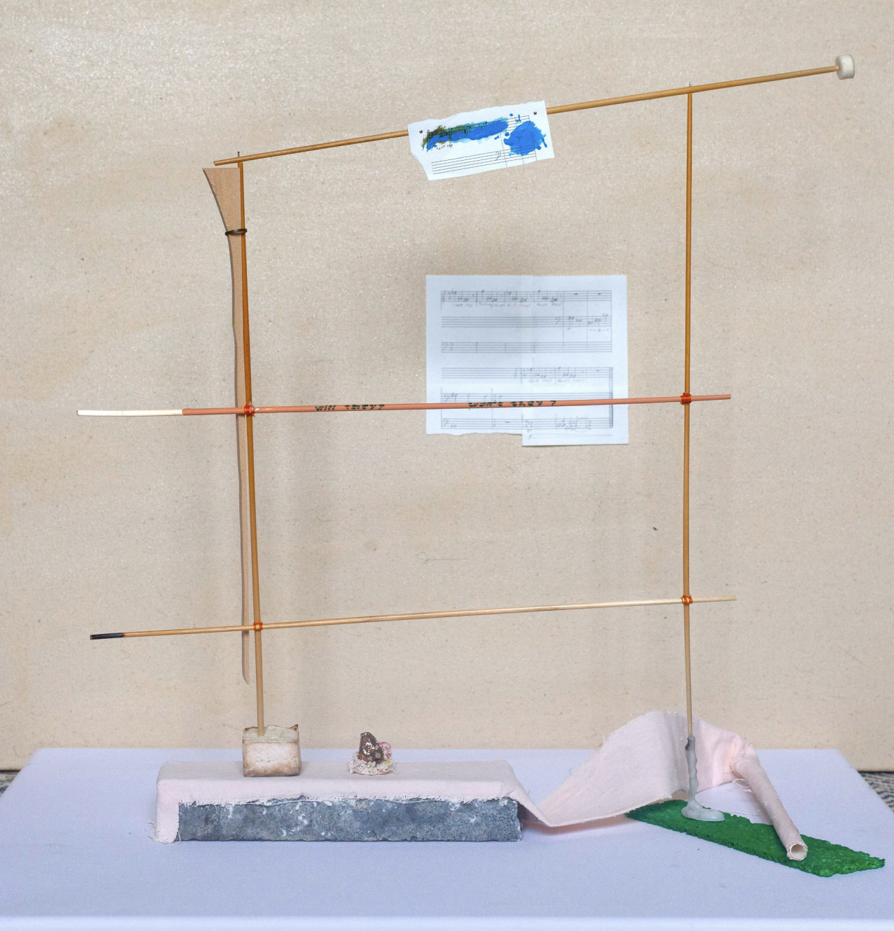Being concerned with the durational qualities of materials and combining objects with music and organised sound, performance traditions, writing, and dramaturgy. Longer lasting materials like stone are placed side by side with fast-paced materials like a song or a beam of light – and the work emerges out of the friction between the intersecting temporalities.